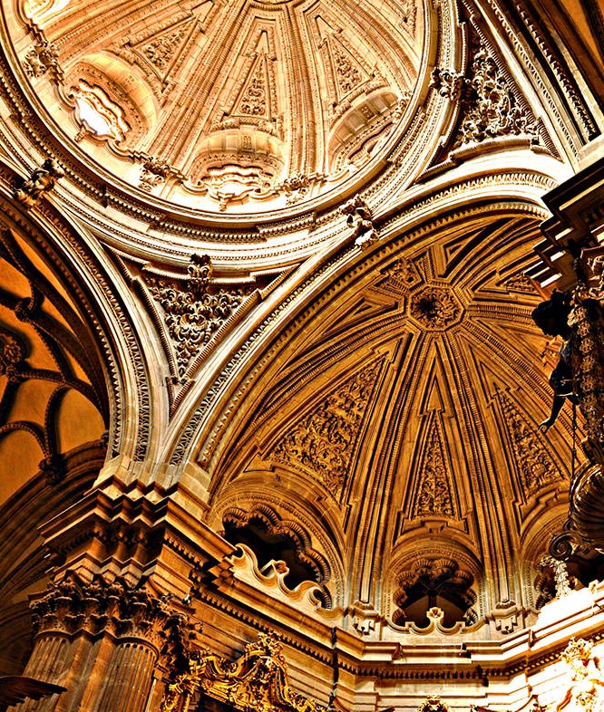 Así, en las bóvedas del primer tramo de las naves que conforman la planta se aprecian las arcadas ojivales tan características del gótico, dando paso a medida que avanzan, a los arcos de medio punto más característicos del Renacimiento y del Barroco, reforzados por altas pilastras, poderosas ménsulas y decorados pilares cruciformes ricamente embellecidos. Ya en la girola (de una belleza clasicista sorprendente), y sobre todo en el presbiterio, advertimos la presencia de la fase más densa y abigarrada en la decoración.